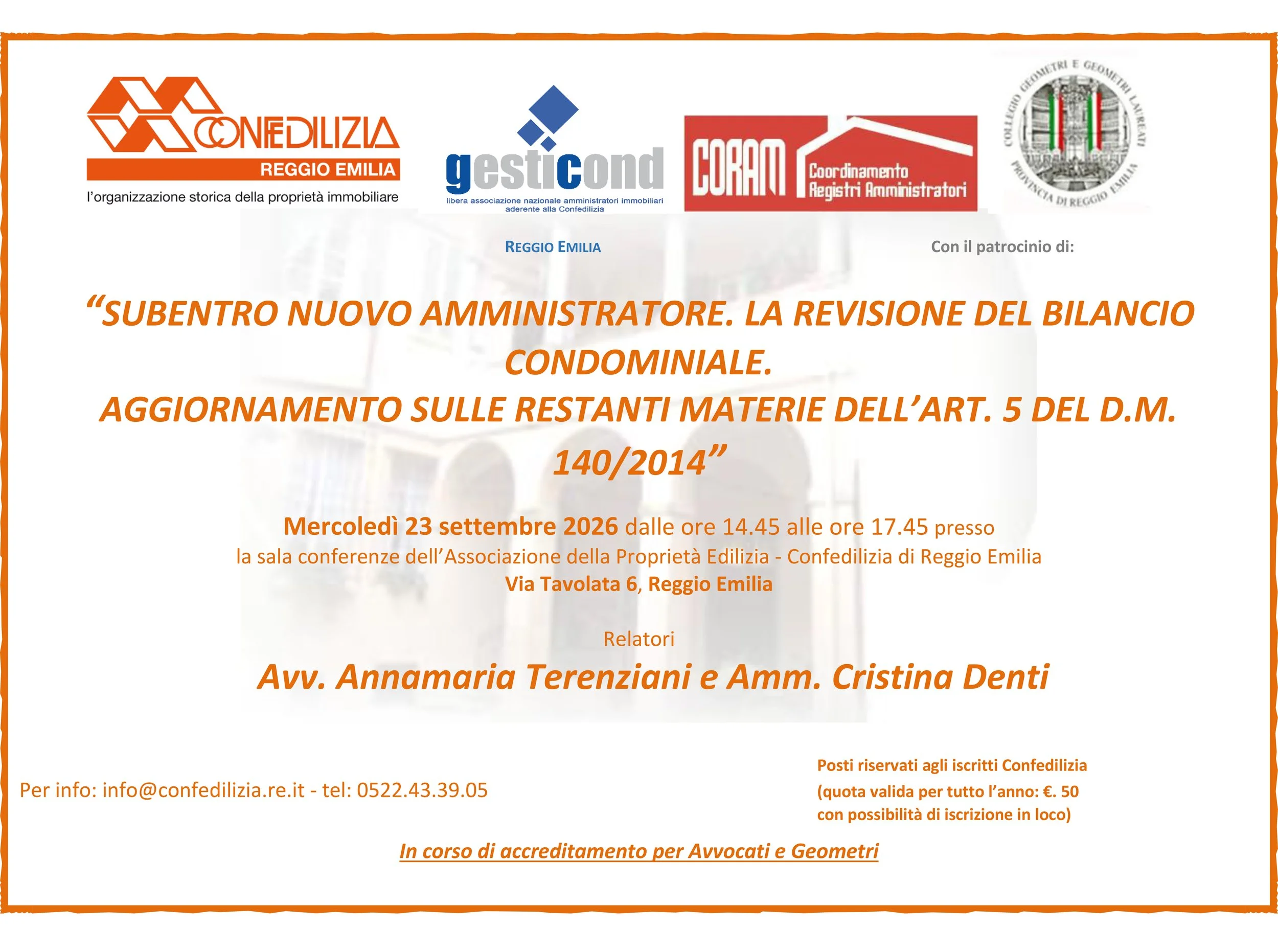 Subentro nuovo amministratore; La revisione del bilancio condominiale; Aggiornamento sulle restanti materie dell'art. 5 del D.M. 140/2014